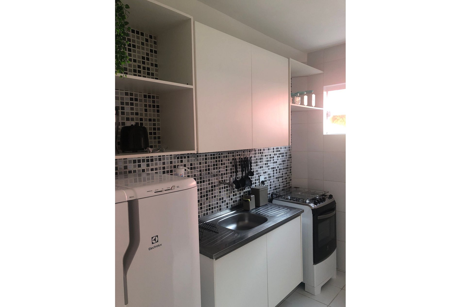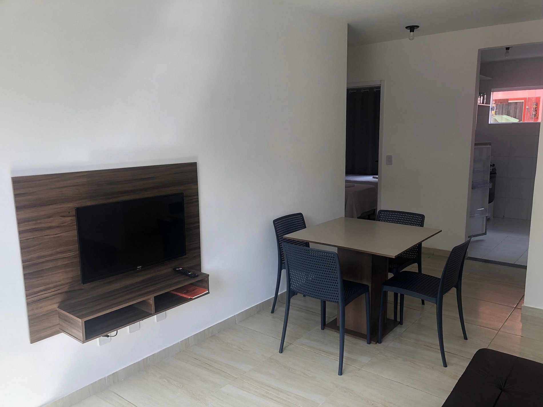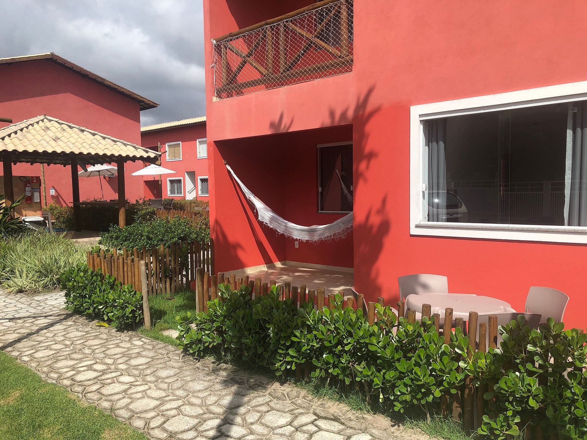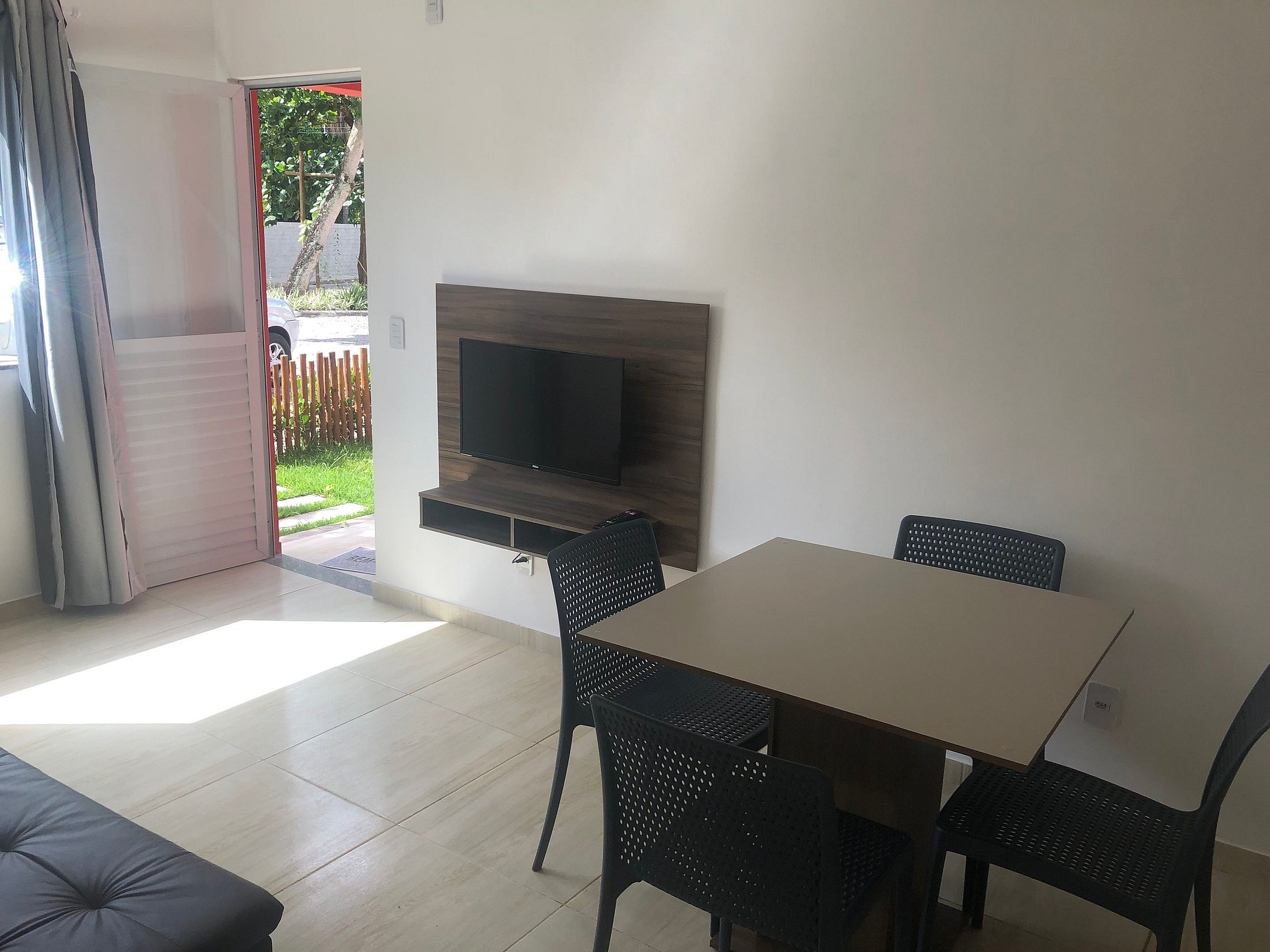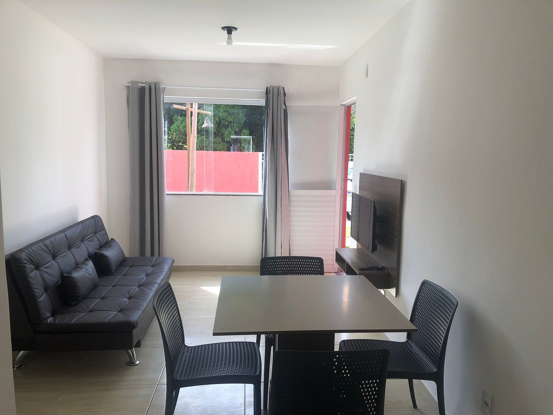 Apartamento novo e elegante em condomínio fechado, localizado em Monte Gordo, a 5Km da praia de Guarajuba, tem acomodações bem confortáveis, com 2 quartos, sala, varanda, cozinha, 1 banheiro, área de serviço e na frente junto à varanda um jardim com mesa, cadeiras e um sombreiro.